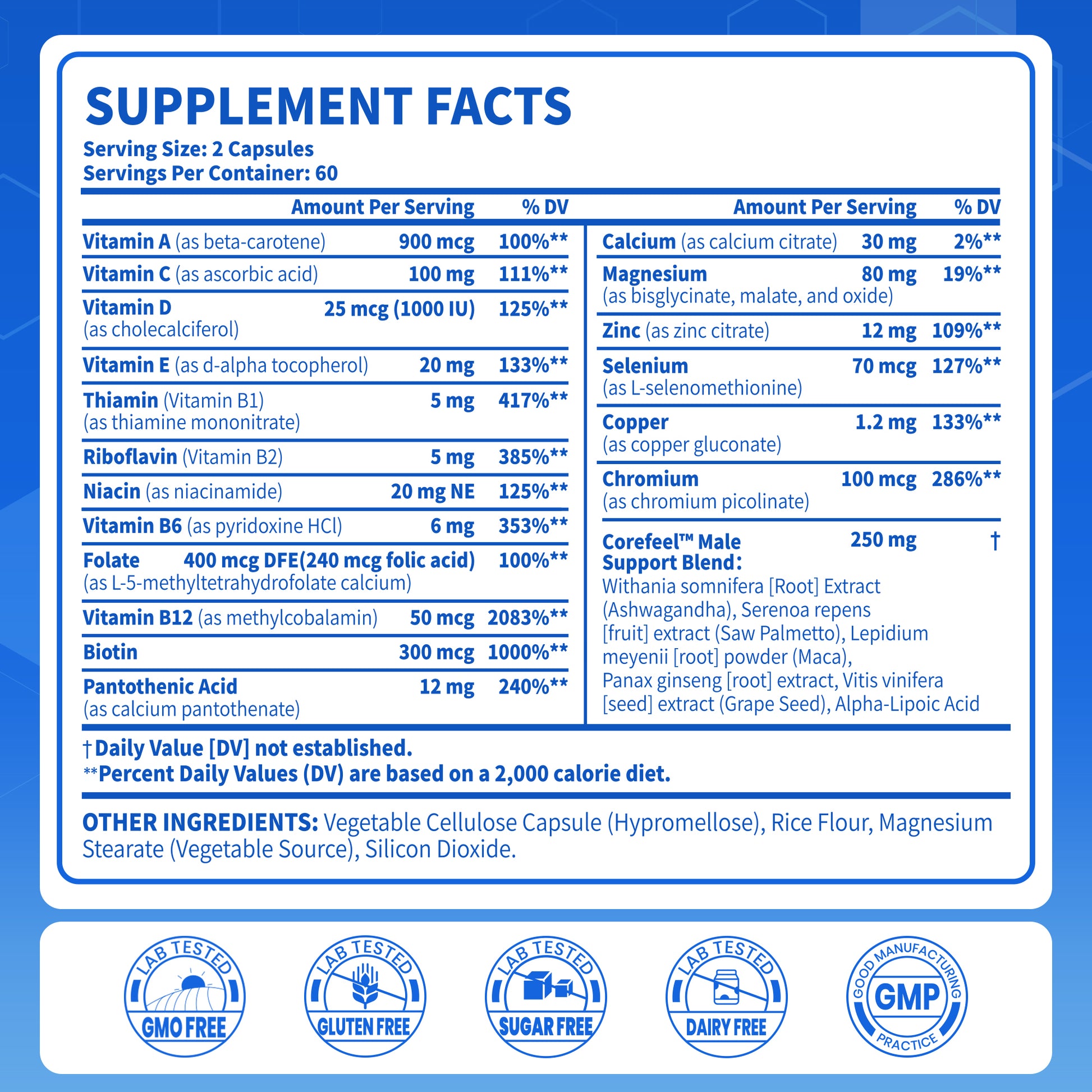 - Men’s Health Support: This men’s multivitamin contains Zinc and Selenium to support male wellness and vitality, Vitamin D and Calcium for bone strength, Magnesium for muscle function, and B-Complex vitamins for sustained energy. Specially designed to meet men’s daily health needs